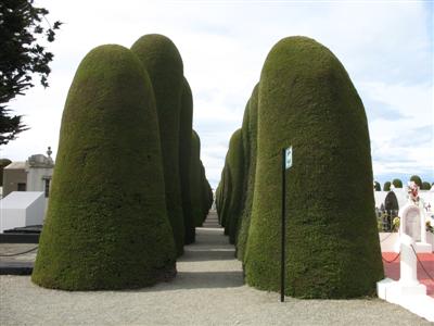 Die wichtigste Sehenswuerdigkeit in Punta Arenas scheint taetsachlich der Friedhof zu sein, wenigstens wenn man die Pinguin-Tours nicht miteinbezieht. Der Friedhof ist also tatsaechlich interessant, das ist kein Witz! Habe zuvor auch nicht wirklich geglaubt, dass ich jemals als Toursit einen Friedhof besichtigen werde, das war aber denoch ein guter Insider-Tip! Das interessante sind uebrigens nicht die Graeber, sondern vielmehr die Hecken oder treffender die gruenen Saeulen.