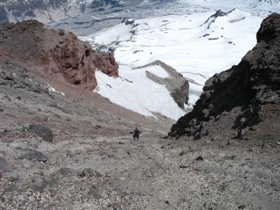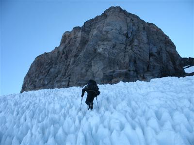 Nach etwa 1000Hm erreichten wir die ersten Schneefelder. Die Sonne verdeckte langsam die letzten Sterne und ein kuehler Wind erlaubte das Tragen unserer Windschutzjacken, was als Sonnenschutz sehr willkommen ist. Steigeisen waren ueberfluessig, der Schnee sehr griffig und vor allem stark zerfurcht. Die Furchen wurden immer unangenehmer und schon bald mussten wir uns regelrecht einen Weg durch sogenannte Penitentes-Felder schlagen. Keine Ahnung wie diese Dinger auf Deutsch heissen, fuer die Interessierten gibt es da eine Beschreibung der Penitentes inklusive Link zu einem mathematischen Modell fuer die mathematisch interessierten unter uns.