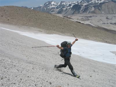 Es war angenehm warm, so blieben wir etwa 1 Stunde auf dem Gipfel haengen uns sogen die Wahnsinnsaussicht in uns auf. Das Wetter war einfach perfekt an diesem Tag. Der Abstieg erwies sich als erfreulich einfach. Die befuerchteten steilen Geroellfelder liessen sich prima abrutschen, so dass wir unser BC nach etwa 2.5 Stunden heil wieder erreichten.
