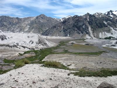 Die Landschaft war einfach unheimlich schoen. Weisses Tuff-Kies, durchsetzt von dunklem Lavagestein, schneebedeckte Gipfel und gruene Wiesenflaechen.