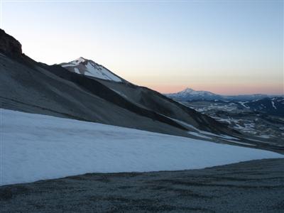 Nach etwa 1000Hm erreichten wir die ersten Schneefelder. Die Sonne verdeckte langsam die letzten Sterne und ein kuehler Wind erlaubte das Tragen unserer Windschutzjacken. Steigeisen waren ueberfluessig, der Schnee sehr griffig und vor allem stark zerfurcht. Die Furchen wurden immer unangenehmer und schon bald mussten wir uns regelrecht einen Weg durch sogenannte Penitentes-Felder schlagen. Keine Ahnung wie diese Dinger auf Deutsch heissen, fuer die Interessierten gibt es da eine Beschreibung und ein Link zu einem mathematischen Modell.