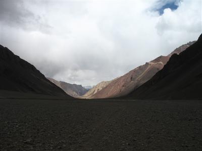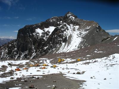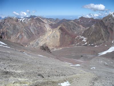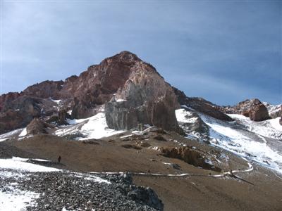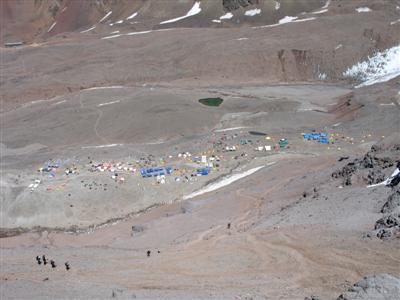 Am naechsten Morgen stehen wir gemuetlich nach 08:00 auf und verplaembern die Zeit. Wir wollen heute noch bis mindestens ins Basislager der Normalroute PLAZA DE MULAS 4200m, wo es bereits Bier oder noch besser Cola gibt, oder falls moeglich gleich weiter bis CONFLUENZIA 3400m. Der Abstieg erfolgt ueber die beruehmten Geroellhaenge der HORCONES-Seite (NORMAL-Route), die dem Berg den Ruf eines Schutthaufens aufgepraegt haben. Schade, das hat der gar naemlich nicht verdient, wenn er von der VACAS-Seite (POLAKEN-Route) her betrachtet wird.