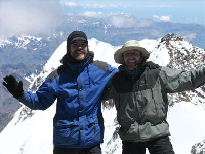 Der Gipfel kommt immer naeher, die Leute keuchen zum Teil bedenklich und scheinen ihrer gestellte Aufgabe nicht ganz gewachsen. Das bestaetigt auch ein Typ der vor mir vom Weg faellt und sich nach 3-4m im Geroell wieder faengt. Glueck gehabt, solche Stuerze sind mit Steigeisen an den Fuessen nicht ganz so harmlos. Er wird sofort von einem Fuehrer und einer weiteren Person betreut. Etwas vorsichtiger und vor allem konzentrierter setze ich meinen Weg fort. Der Gipfel erscheint immer naeher, die Hoffnung ihn wirklich zu erreichen macht sich breit. Thomas ist mir noch immer nicht entgegengekommen. Dafuer begruesst er mich am Gipfel. Tatsaechlich, es ist geschafft! Der hoechste Gipfel ausserhalb des Himalaya's, prominentes Mitglied der SEVEN SUMMITS. Auf 6962m, praktisch windstill mit schoenem Sonnenschein bestaune ich eine geschlagene Stunde lang die Welt von oben.