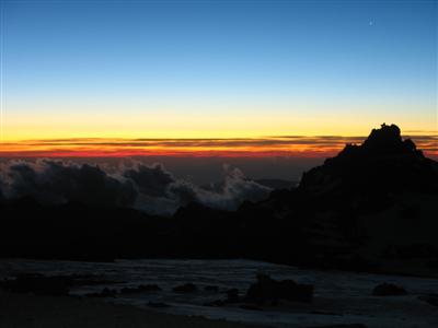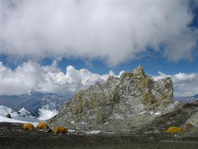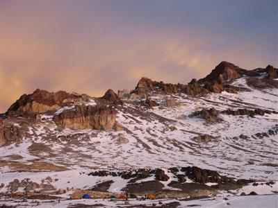 Das LOWER WHITE ROCKS Camp auf 5970m ist von malerischen Felsen umgeben, man fuehlt sich sofort ans heimische Mittelmeer eriennert. Fuer den naechsten Tag sind nur noch 40km/h angesagt. Unser Gipfeltag scheint gekommen. Mit der Hoehe klappt soweit alles, keine Beschwerden. Einen Teil des vorabendliche Schneeschmelzen verschieben wir grosszuegig auf den Morgen.