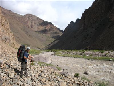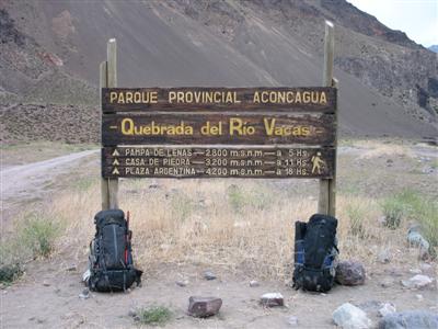 Zusaetzlich nehmen wir das erste Abend- und Morgenessennehmen separat mit. Wir haben vor eine Nacht in PUNTA DE VACAS zu verbringen und dann am Morgen frueh unsere Tour zu starten. Planmaessig starten wir unsere Tour, Wasser steht uns leider nur aus dem sehr schlammigen Hauptfluss zur Verfuegung. Wir kommen voran und checken in LAS LENAS 2800m ein. Wir erhalten einen numerierten persoenlichen Abfallsack. Als wir gleich weiter wohlen sind die Guards dich etwas erstaunt, 'alpinestyle, aha!'. 'El routa polaco is in a very good state'. Toent gut, der Verdacht, dass das seine einzigen Worte Englisch sind draengt sich leise im Hintergrund auf. Planmaessig spaet erreichen wir am ersten Abend CASA PIEDRA auf 3200m. Auf dem selben Platz stehen bereits mindestens 2 Expeditionen, eine von Schaffhausern, die andere wild zusammengewuerfelt mit einigen Schweizern von der Kari Kobler-Gruppe. Diese Leute sind mit einem Zwischenlager in LAS LENAS 2800m und dem ueblichen Gepaecktransport per Maultier bestens erholt.