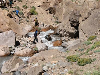 Am naechsten Morgen machen wir uns auf ins Basislager. Als erstes liegt ein verdammt kalter Fluss vor uns. Die Teilnehmer der Expeditionen werden bequem mit den Maultieren rueberchauffiert. Wir hingegen kriegen kalte Fuesse.