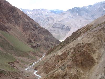 Wir folgen dem Flusslauf und wollen den Fluss moeglichst weit oben ueberqueren. Schlechte Wahl, wir quaelen uns entlang von schlecht geschichteten Geroellhalden weglos vorwaerts. Irgenwann setzen wir doch noch ueber den Fluss. Die Aufwaermzeit nach der erneuten Kneipp-Kur laesst einem prima Zeit sich endlich mal wieder seinen ueberlangen Zehennaegel zu widmen. Wir steigen die Flanken der Schlucht rauf bis wir den Weg erreichen. Mittlerweile ist es ziemlich kuehl geworden, wir sind ausgepowert vom Vortag und noch immer unterhalb von 4000m. Es beginnt bald auch noch zu schneien, vor uns zeigen sich felsige Schneeberge.