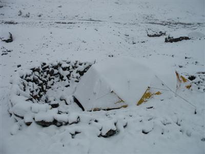 Gerade als wir das Zelt aufstellen beginnt es ernsthaft zu schneien. Die Motivation sinkt gegen den Nullpunkt. Kochen sollten wir auch noch und muede sind wir sowieso schon seit vorgestern. Am naechsten Morgen ist alles weiss bedeckt, wenigstens trockener Pulverschnee (nein, kein Grund neidisch zu werden, mir waere es viiiel lieber gewesen dieser Schnee waere in den ALPEN gefallen!!).