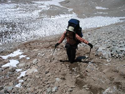 Starker Wind laesst uns ebenfalls eine zweite Nacht im C1 verbringen. Am Nachmittag des zweiten Tages steigen wir zur Akklimatisationsverbesserung symbolisch bis ins COL AMEGHINO auf etwa 5400m hoch. Wir bemuehen uns extra langsam zu gehen, was uns gefuehlsmaessig auch gelingt. Die Uhr zeigt 1h18' an, muss am fehlenden Gepaeck auf unseren Ruecken liegen.