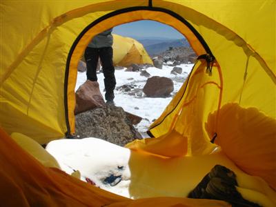 Das Zelt ist schnell aufgebaut und der Gipfeltag auf den naechsten Tag festgesetzt. Wir stehen um 04:00 auf. Dass heisst wir wachen auf und bleiben liegen. Nicht weil wir zu muede sind, aber draussen tobt ein Riesensturm. Thomas nimmt einen Anlauf, der aber mit seinen Schnee-gefuellten Schuhen im Vorzelt ein vorzeitiges Ende nimmt. Durch jede Ritze wird der Schnee reingedrueckt, die Windboeen druecken heftig gegen die Zeltwand. Wir doesen etwas weiter und hoffen auf besseres Wetter. Eher vergeblich, an diesem Tag verlasse ich das Zelt genau 2 mal, Pinkelpause. Kochen ist ebenfalls nicht moeglich, der Benzinkocher im Zelt erscheint mir etwas zu riskant. Unser Zeltnachbar, der Matthias, Angehoeriger einer deutschen Expedition ueberreicht uns eine ganze CHORIZO-Wurst. Die 250g sind die willkommene Abwechslung des Tages. Irgendwie ironisch, Du sitzt im lichtdurchfluteten Zelt waehrend draussen der Sturm ueber das Zelt fegt als ob er es am liebsten mitreissen wuerde. Im goldenen Kaefig gefangen. Spaeter erfahren wir, dass an diesem Tag 100km/h gemessen wurden. Endlich ist auch klar warum wir 4.3kg Zelt mit uns schleppen.